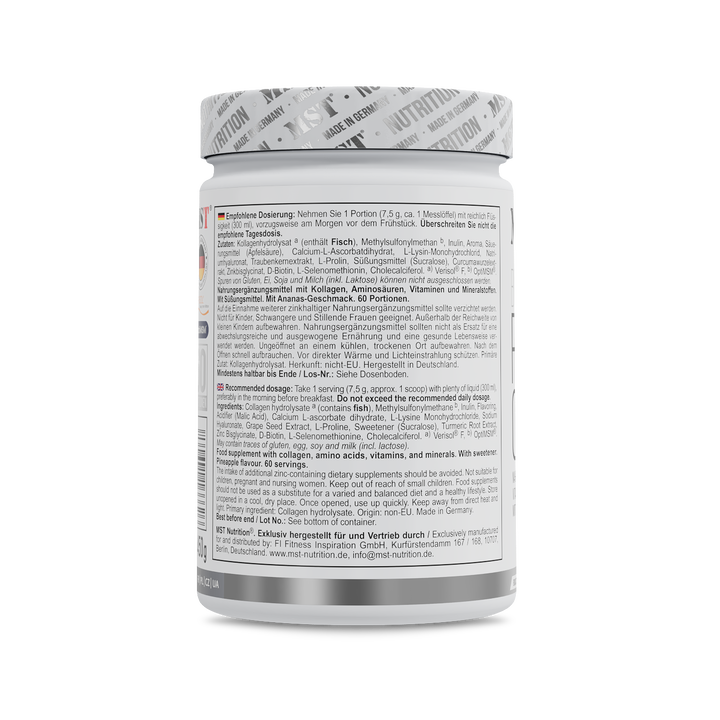 Ein gepflegtes Erscheinungsbild beginnt von innen. MST Beauty Fish Kollagen Verisol 450 g Ananas vereint hochwertige Verisol® Kollagenpeptide aus Fisch mit Vitamin C, Biotin, Zink, Selen, Hyaluronsäure, MSM, Curcuma- und Traubenkernextrakt zu einer durchdachten Formel für die tägliche Ernährung. Das Produkt wird in...