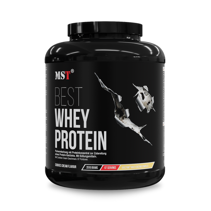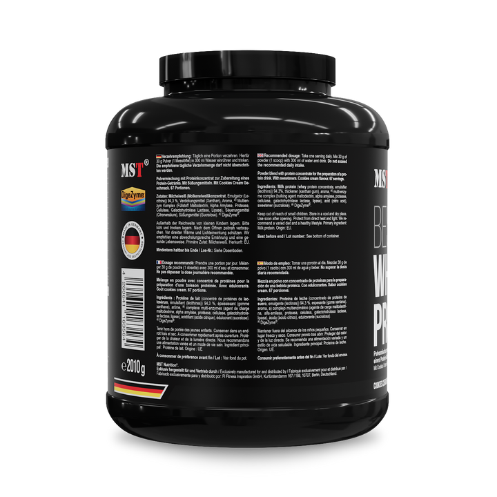 Откройте для себя совершенный протеиновый опыт с MST® BEST Whey Protein Cookies Cream 2010 g, дополненным DigeZyme® — освежающей комбинацией, которая снабжает ваше тело высококачественным белком и пищеварительными ферментами.